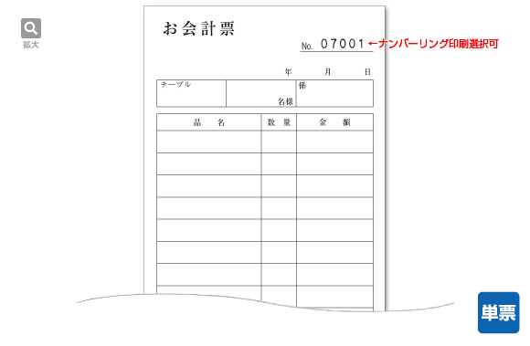 飲食店などで使われる一般的なお会計票です。ナン バーリング印刷もお選びいただけます。